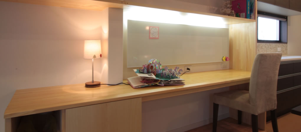 実は子供部屋にこもって勉強するよりも皆がいるリビングで勉強する方が勉強の効率も上がるそうです。勉強以外にも絵本を読んであげたり、アルバムを一緒に見たり、親子の絆をつなげるスペースになればと思い、考案したスペースです。 -