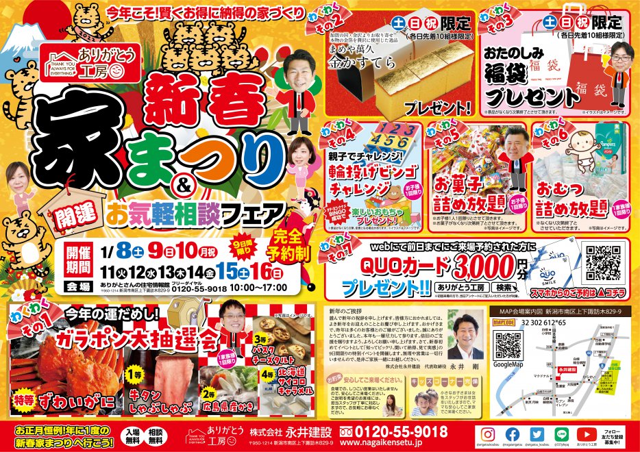 | ありがとさんの住宅情報館【新春家まつり】完全予約制 --------------------------------------------------------------------------------------------------------------------- 開催概要 1月8日(土)9日(日)10日(月祝)~15日(土)16日(日)※9日間限り 10:00~17:00 ※完全予約制となりますので、ご来場の前日の18時までにご予約をお願いいたします。 会場 : 新潟市南区上下諏訪木829-9 ありがとさんの住宅情報館 ★予約特典★ ご来場の前日までにwebでご予約のお客様には QUOカード3,000円分をもれなくプレゼント! ※はじめてご来場のお客様が対象です。 わくわくその1 今年の運だめし!ガラポン大抽選会 わくわくその2 土日祝限定 先着10組様限定 まめや萬久「金カステラ」プレゼント! わくわくその3 土日祝限定 先着10組様限定 おたのしみ福袋プレゼント! わくわくその4 輪投げビンゴチャレンジ! わくわくその5 ママチャレンジ!おむつ詰め放題 わくわくその6 お菓子詰め放題! わくわくその7 web予約でQUOカード3,000円分プレゼント! 皆様のご来場をお待ちしております! ご予約は下の予約フォームにてお願いいたします。 |