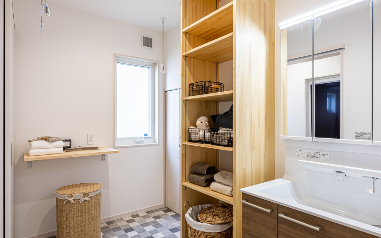 収納たっぷり洗面所 洗濯➡物干し➡アイロンがけ➡収納がこのスペースですべてすることができるして、ママの家事を助ける効率動線で家事の時間を短くし、楽に生活できるようにします。