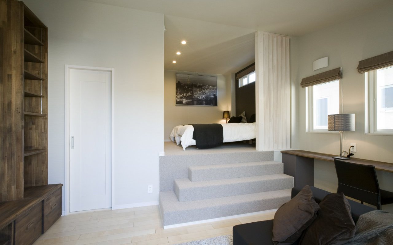大人モノトーンで仕上げた小上がり寝室のあるお部屋