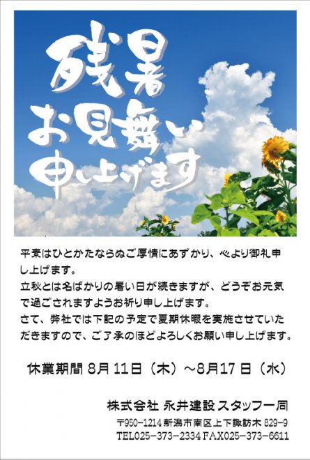 さて、弊社では下記の予定で夏期休暇を実施させていただきますので、ご了承のほどよろしくお願い申し上げます